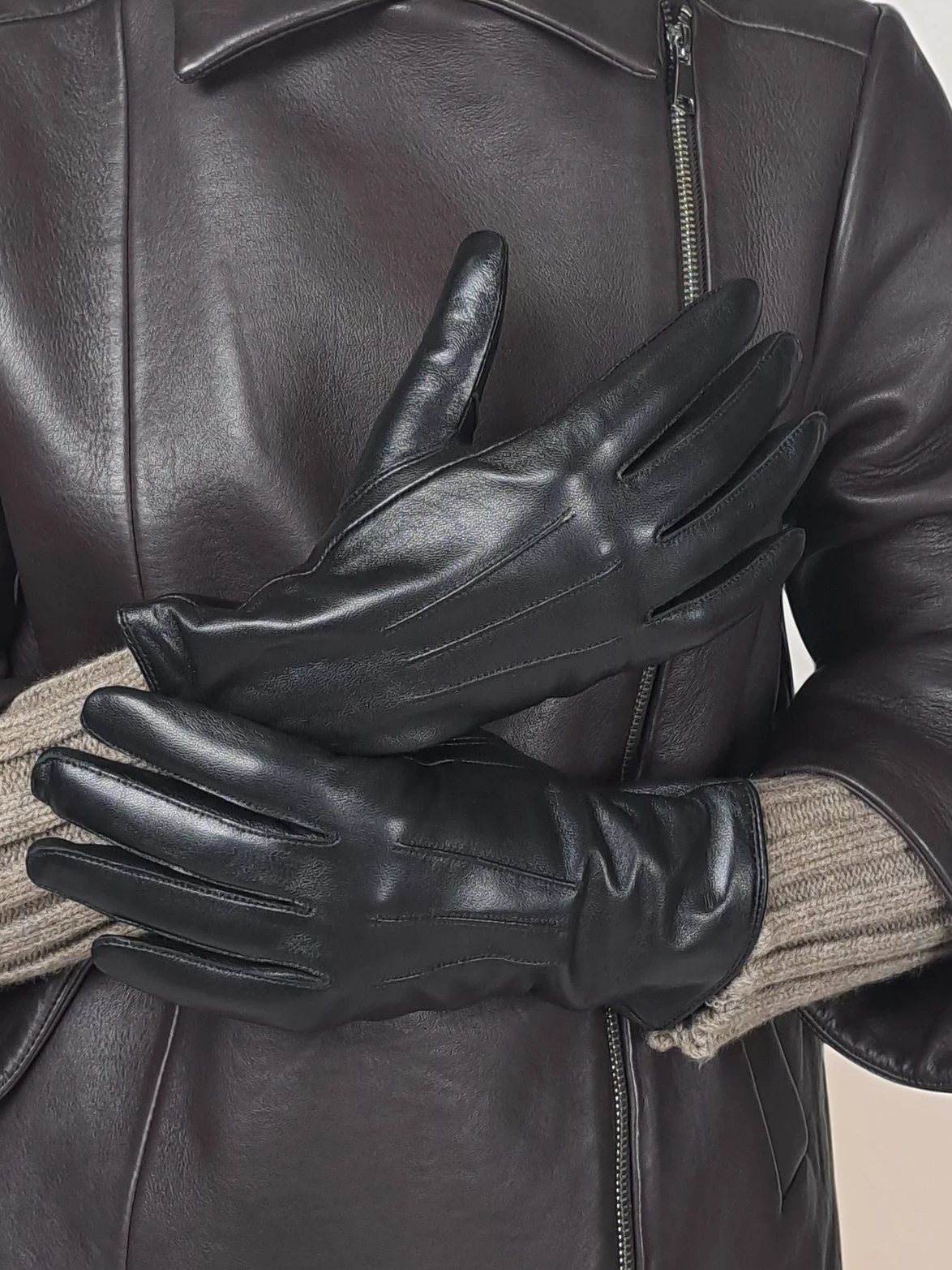 Elevate your winter wardrobe with these refined leather gloves crafted from supple lamb slink leather. Designed for the discerning woman, they feature responsive touch technology that keeps you connected to your devices without removing your gloves. The luxurious lining blends 70% wool with 30% acrylic for exceptional warmth and comfort throughout the season. Expertly made by Levinsky, these timeless black gloves combine classic elegance with modern functionality.
