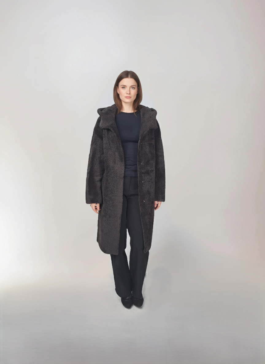 Iluka vereint Komfort mit raffinierter Anpassungsfähigkeit. Diese 100-cm-Kapuzenjacke aus üppigem lockigem Lammfell verfügt über einen verstellbaren Bund, mit dem Sie die Silhouette nach Ihren Wünschen anpassen können. Doppelte seitliche Reißverschlüsse verbessern die Funktionalität und schaffen dynamische Styling-Optionen, indem sie die Proportionen der Jacke mühelos verändern. In warmen Kaffeetönen bietet Iluka dezente Eleganz mit praktischer Raffinesse für die moderne Garderobe.