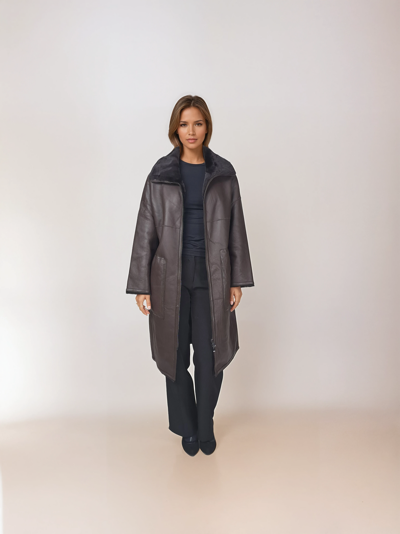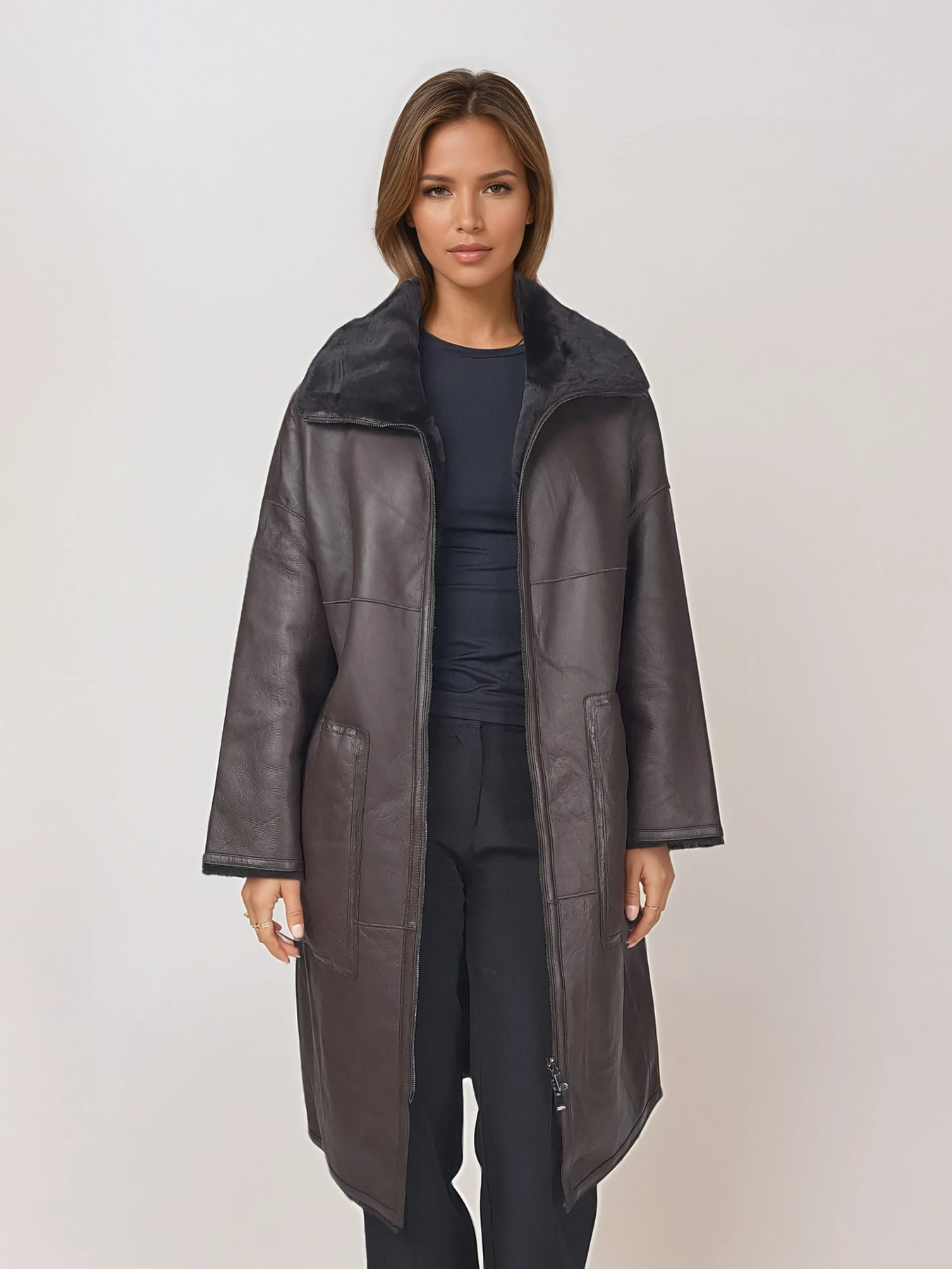 Isilda bietet außergewöhnliche Vielseitigkeit durch seine innovative Wendekonstruktion. Diese 105-cm-Jacke präsentiert sich auf einer Seite mit Lammnappa und ist an der Innenseite und am Kragen mit luxuriösem Pelz gefüttert, sodass Sie sie auf zwei unterschiedliche Arten tragen können. Drehen Sie es um, um eine völlig andere Ästhetik zu erhalten und gleichzeitig erstklassigen Komfort und Eleganz zu bewahren. Dunkelbraune Eleganz trifft auf praktischen Luxus – eine Jacke, unendliche Styling-Möglichkeiten.