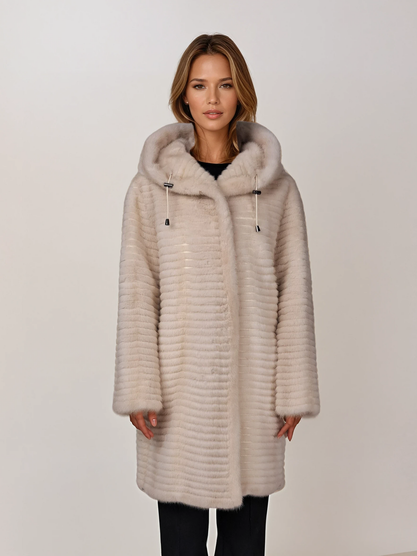 Norma, 90 cm. - Kapuze - Nerz - Damen - Perle Erleben Sie zeitlose Eleganz mit dieser großzügigen Kapuzenjacke aus luxuriösem Nerz mit Perlmutt-Finish. Das innere Bindeband an der Taille ermöglicht eine mühelose Anpassung, sodass Sie die Silhouette nach Ihren Wünschen gestalten und gleichzeitig ein elegantes Erscheinungsbild bewahren können. Mit einer Länge von 90 cm bietet dieses Stück eine große Abdeckung und eine beeindruckende Präsenz, perfekt zum Schichten oder Tragen als Statement-Oberbekleidungsstück. Die Kapuze sorgt für Vielseitigkeit und verbesserten Schutz. Eine anspruchsvolle Wahl für die Frau, die in ihrer Garderobe Wert auf hochwertige Verarbeitung und dezenten Luxus legt.