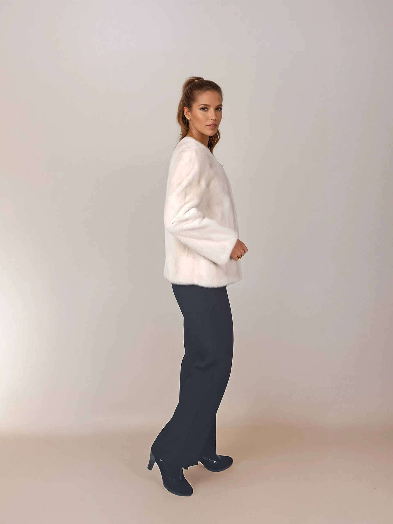This exquisite women's mink jacket in pearl showcases refined elegance at 60 cm. Meticulously crafted from premium mink, it offers luxurious warmth and a soft, luminous finish that flatters every complexion. Perfect for the woman seeking timeless sophistication, this jacket seamlessly transitions from day to evening, delivering both comfort and enduring style.