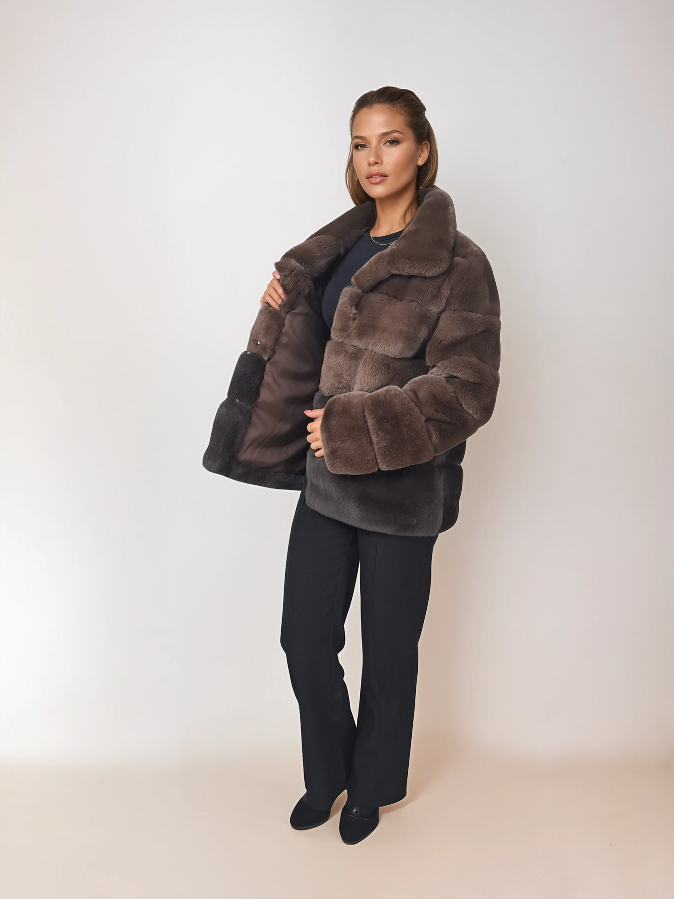 Stay warm and stylish with the Hanon, a 65 cm woman rex jacket featuring 2 tone colours - Pastel and Chocolate brown. Crafted with high-quality materials, this jacket will keep you cozy while adding a touch of elegance to your wardrobe. Perfect for any occasion, this jacket is a must-have for any fashion-forward woman.