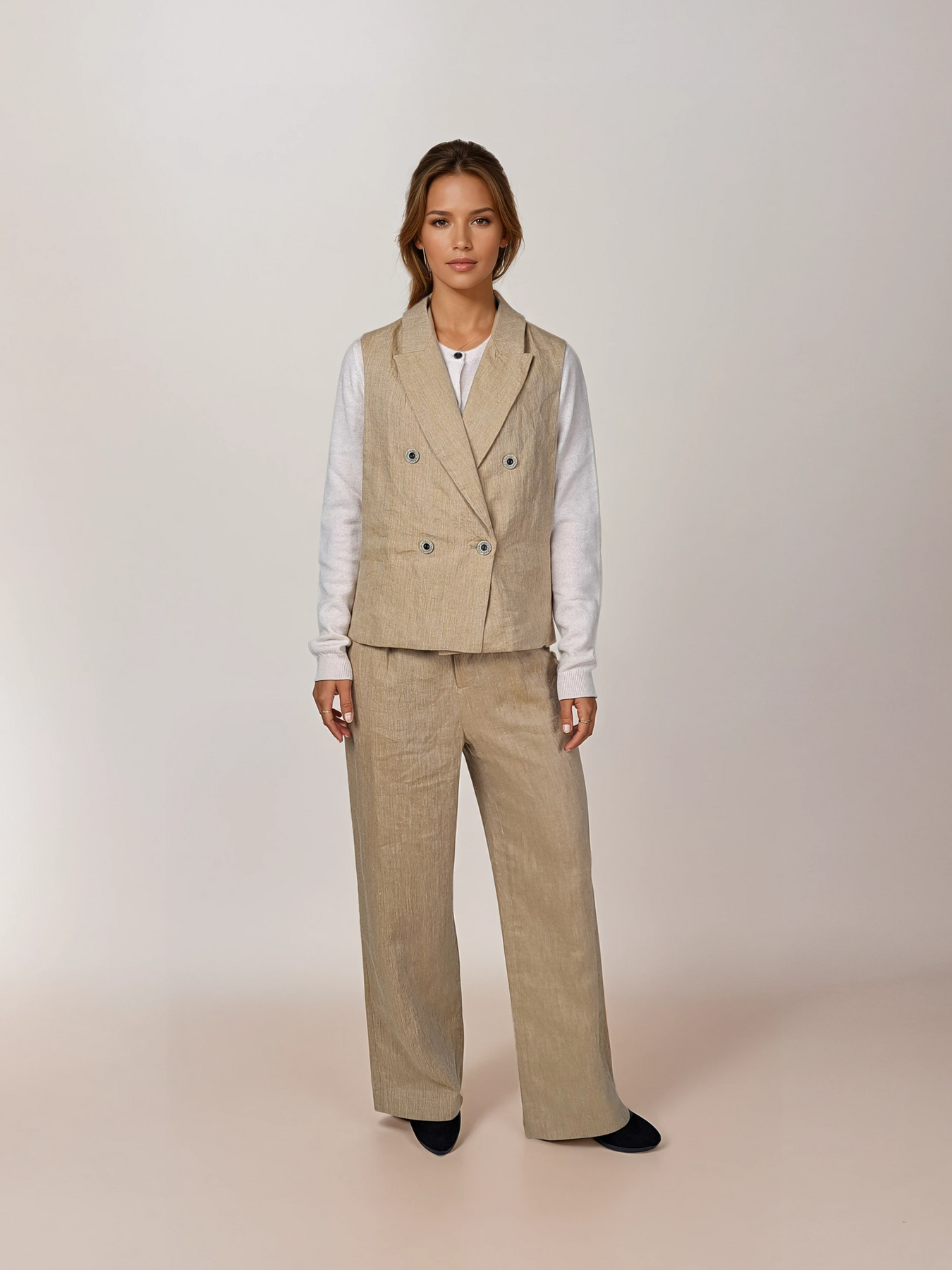 Crafted from organic cotton and linen, the Linen Vest in oatmeal offers a refined layering piece for women. Its natural fabric ensures breathable comfort, while the tailored design provides a polished silhouette. Perfect for elevating both casual and formal outfits with effortless sophistication.