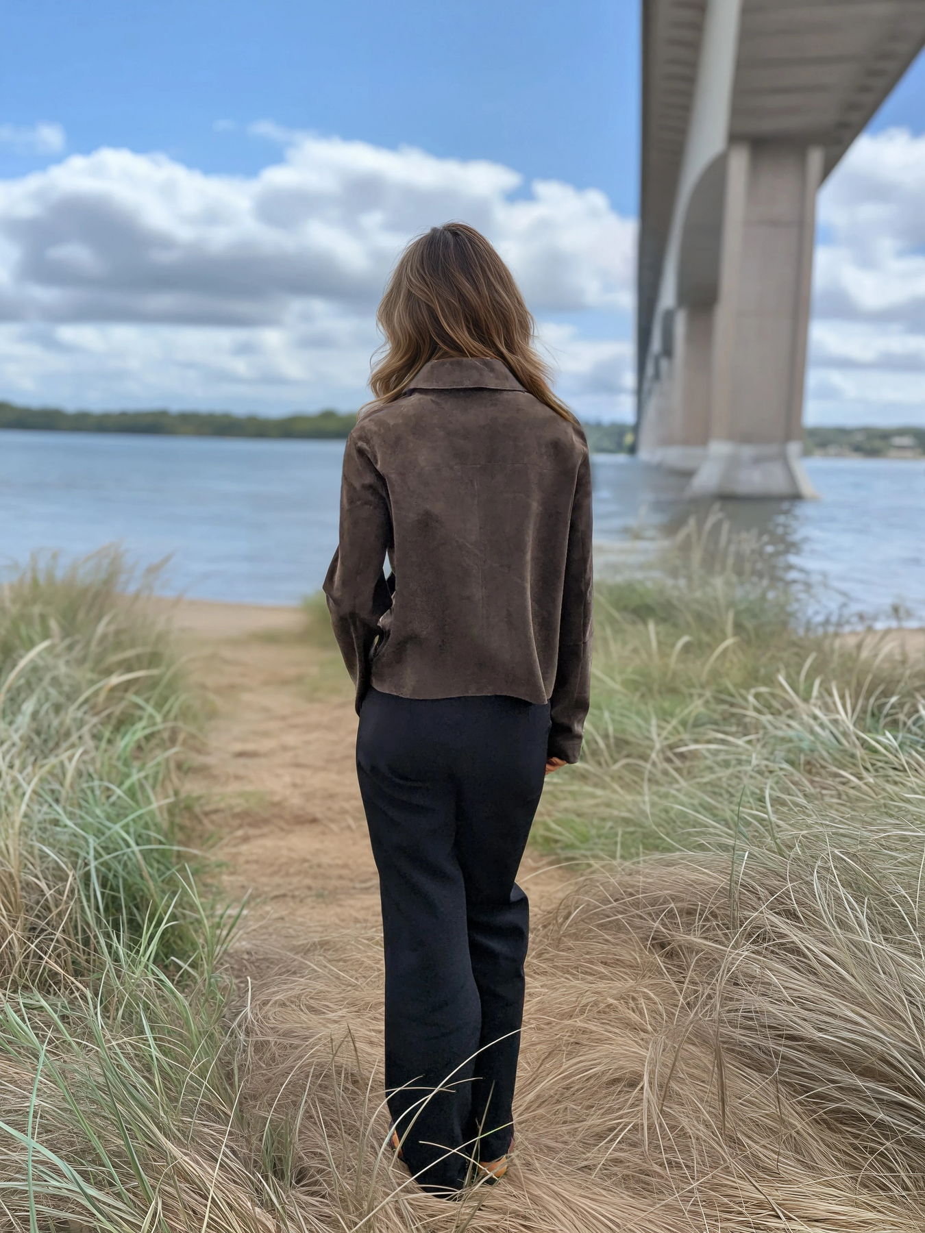 Experience timeless elegance with the Vida goat suede jacket in olive. Crafted by Levinsky, this women's jacket features soft, durable goat suede for a luxurious feel and a unique cow-printed bonded lining that adds a stylish surprise inside. Perfect for elevating your wardrobe with a blend of comfort and distinctive design.