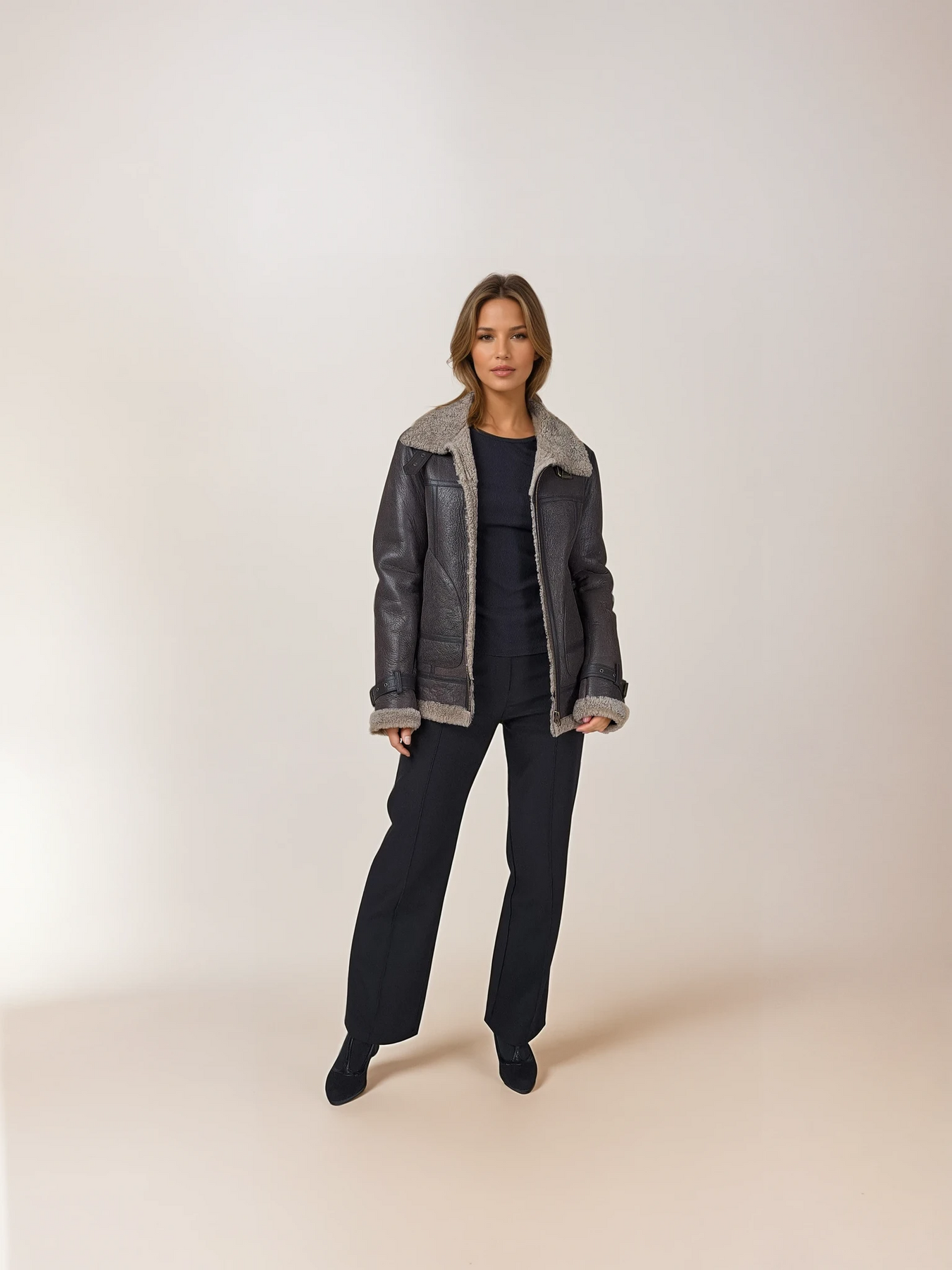 A classic shearling bomber jacket for women is a stylish piece of outerwear that combines the timeless bomber jacket design with the luxurious warmth and softness of shearling fur. This jacket features a relaxed fit with lamb fur cuffs and hem, providing a snug fit around the waist and wrists. It has a front zipper closure and a shearling fur collar for extra warmth and elegance.