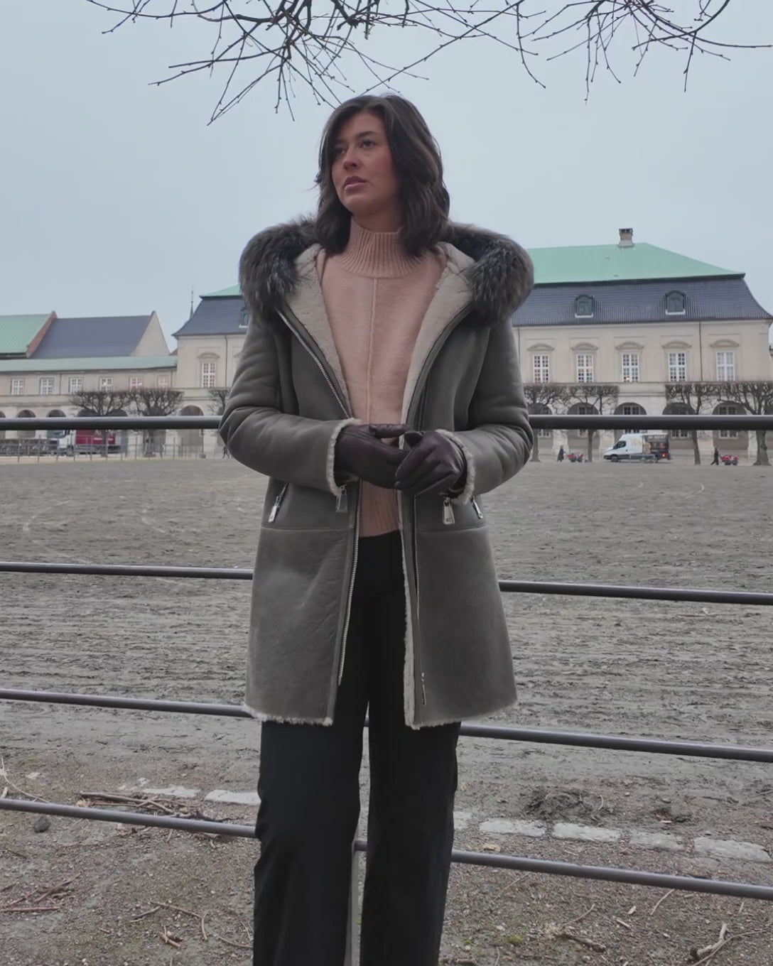 Get ready to turn heads with our Abella shearling lamb jacket. With a cozy hood and cool zippers, this jacket is a must-have for fall and winter. The luxurious raccoon fur trim adds a touch of elegance. Stay warm and stylish in dark brown warm shearling lamb jacket.